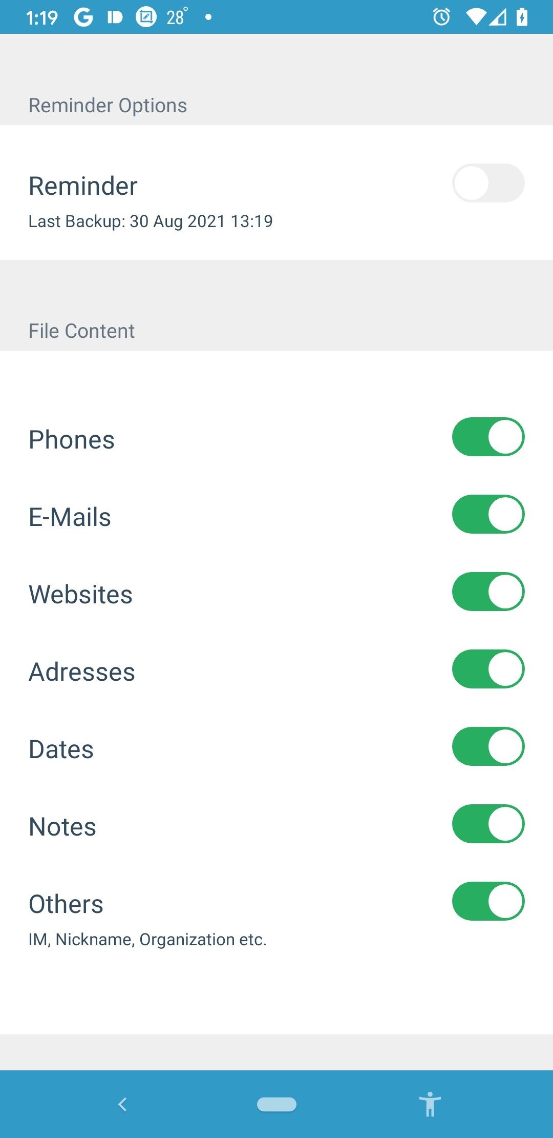 The file will be stored in VCard format (VCF), which can be read on any device. When you want to restore it, just open the file and all the contacts will be immediately recovered. And it's completely free of charge. You can choose whether to save the photo attachments or not and set notifications to remind you to create periodical backups to make sure you don't lose any information.