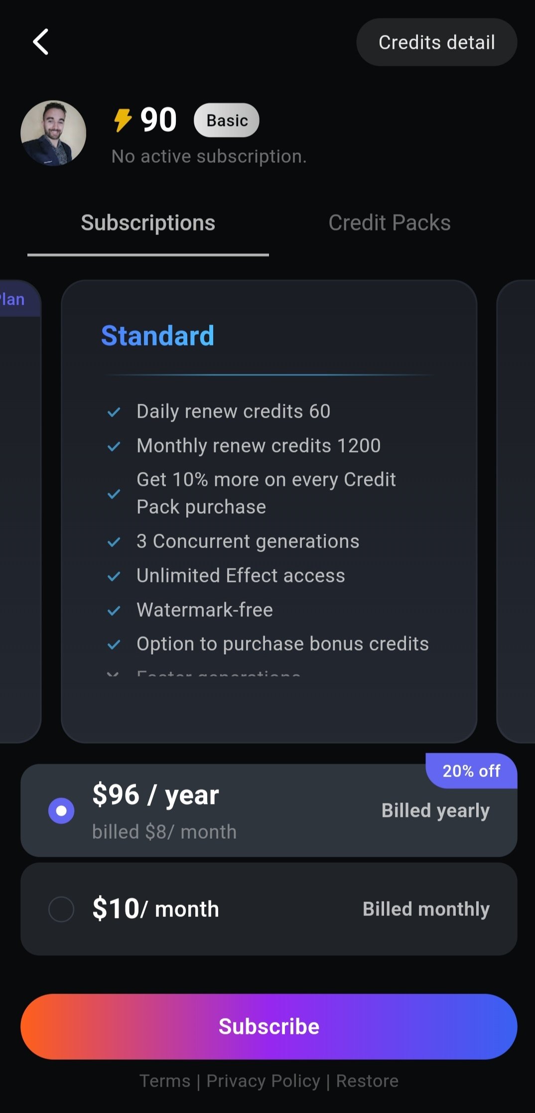 Therefore, keep this limit in mind when you download PixVerse Android for free. You can buy credit packs or subscribe to a monthly or annual payment plan: standard, pro and premium are the three options to use the app with the most advantages.