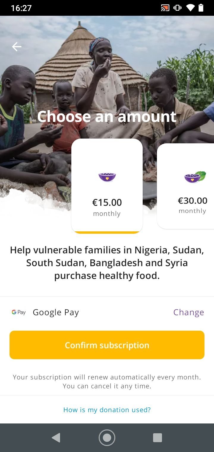 Paying is also very easy, as we can choose between debit or credit card, PayPal and Google Pay. If we want to contribute to a good cause, help end world hunger and feed hungry children, this official UN app makes it very easy for us.