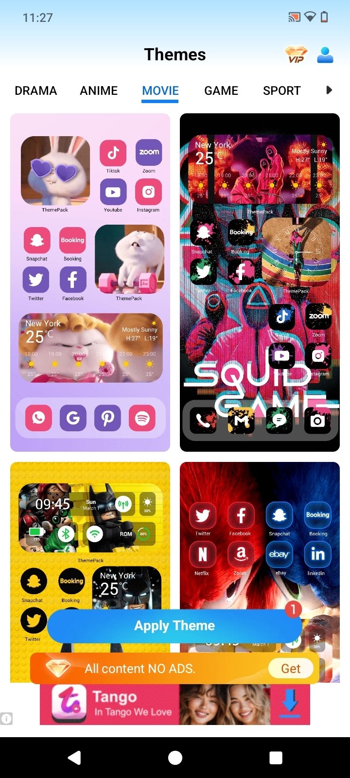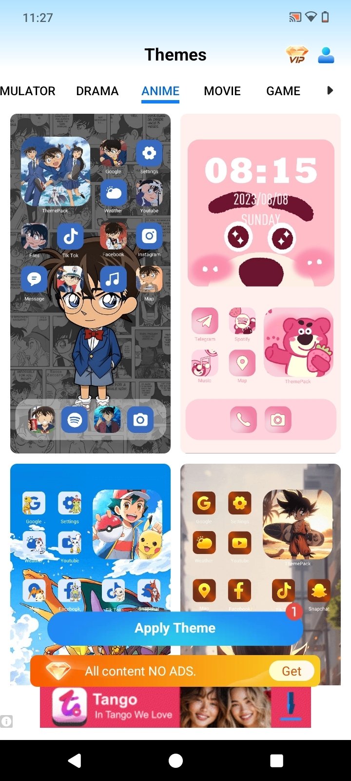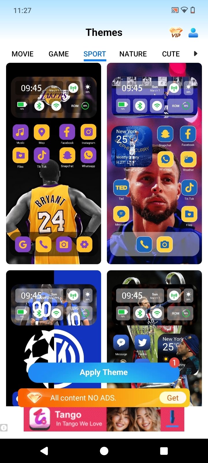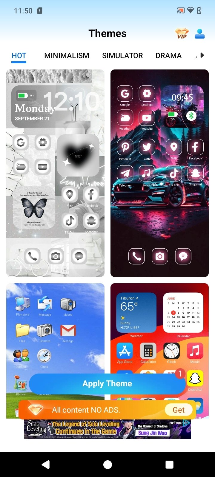 Themes sorted by categories: minimalism, anime, movies, games, sports, nature...