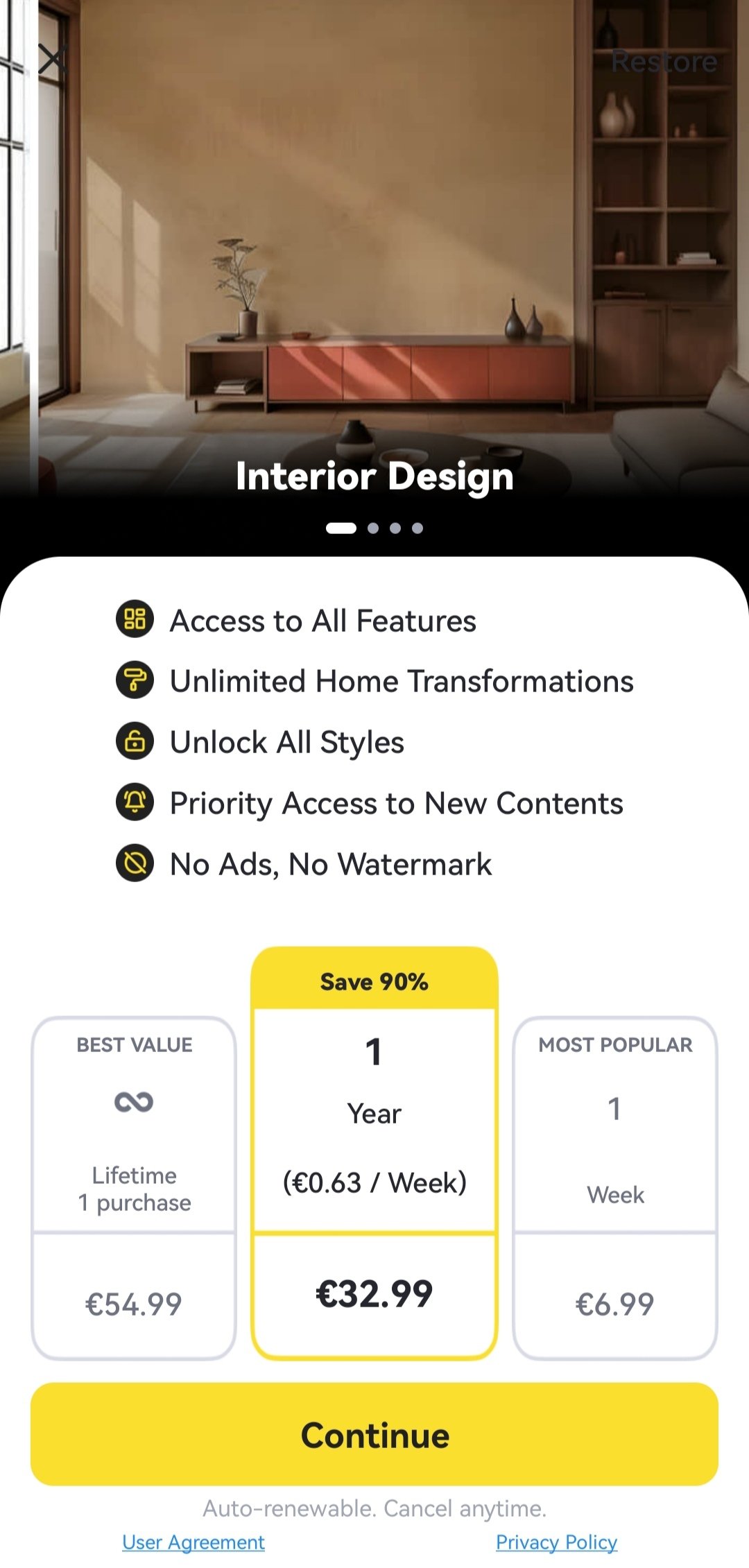 While the app is useful, you can only perform three conversions when you download DecAI Android for free, unless you pay. The annual, weekly, or lifetime subscription gives you access to all styles, unlimited designs, and downloads without watermarks.