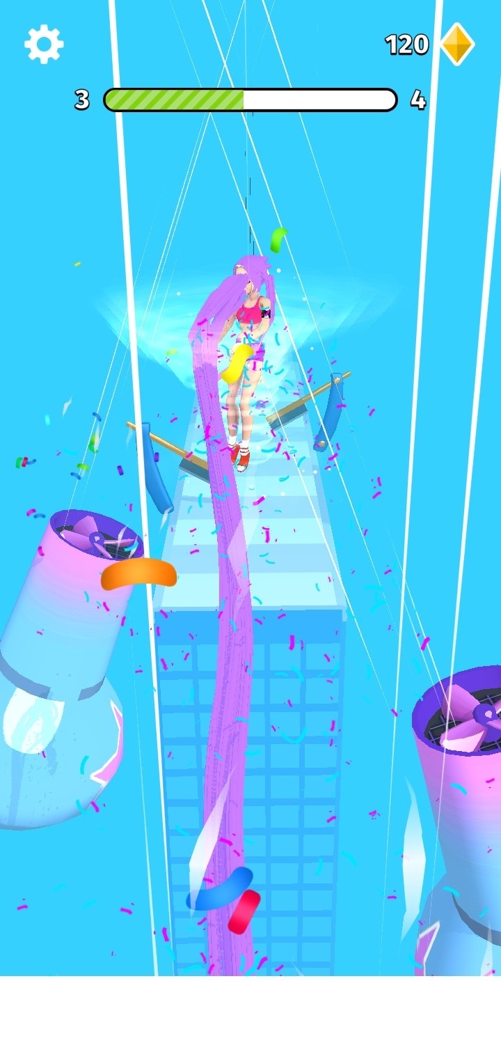 The length of the girl's hair will allow us to float over the turbines and get more prizes when we reach the finish line. Also, a very cool detail of this game is that, as she collects different pieces of hair, her mane will change colour.