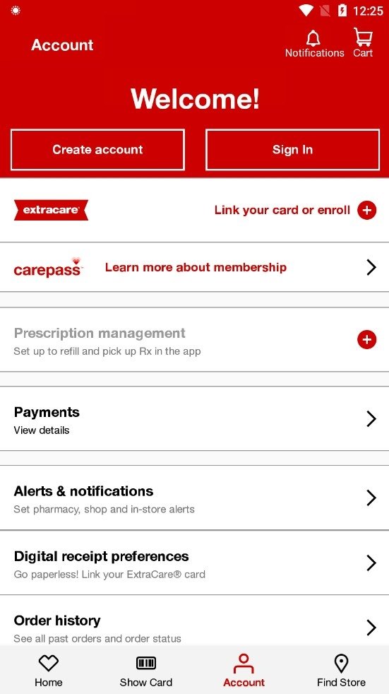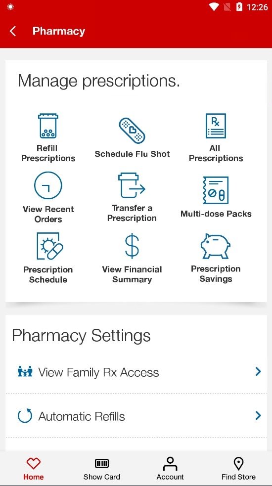 With this app, you can purchase online and have your orders prepared to be picked up at your nearest store. You can use it to fill out prescriptions and also for other services such as developing photos and purchasing pharmacy products.