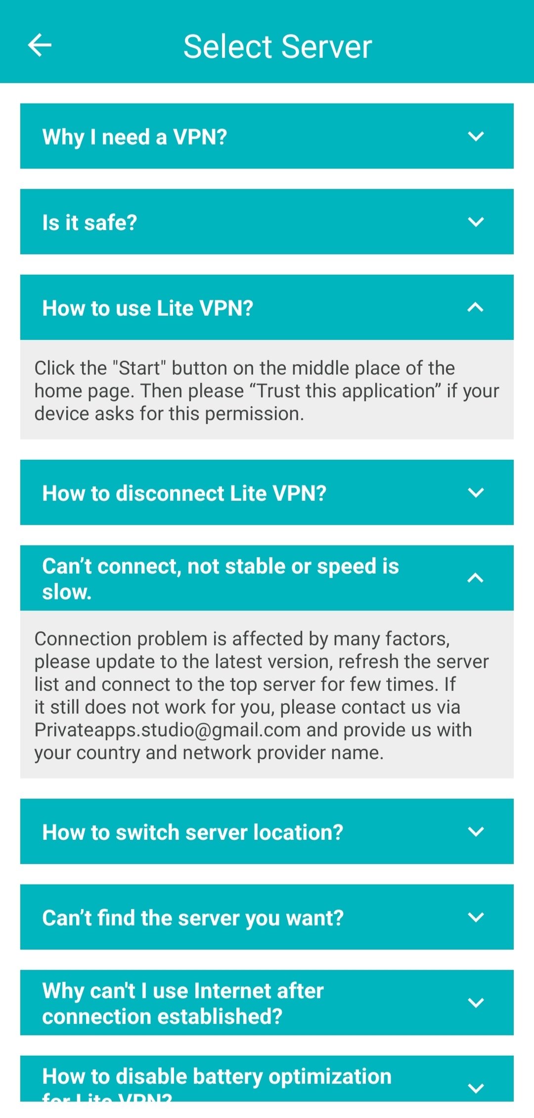 If we have any questions regarding using the app after we download Lite VPN for free, it has a section with 11 FAQs and answers. It doesn't feature a button or link for contacting the developers.