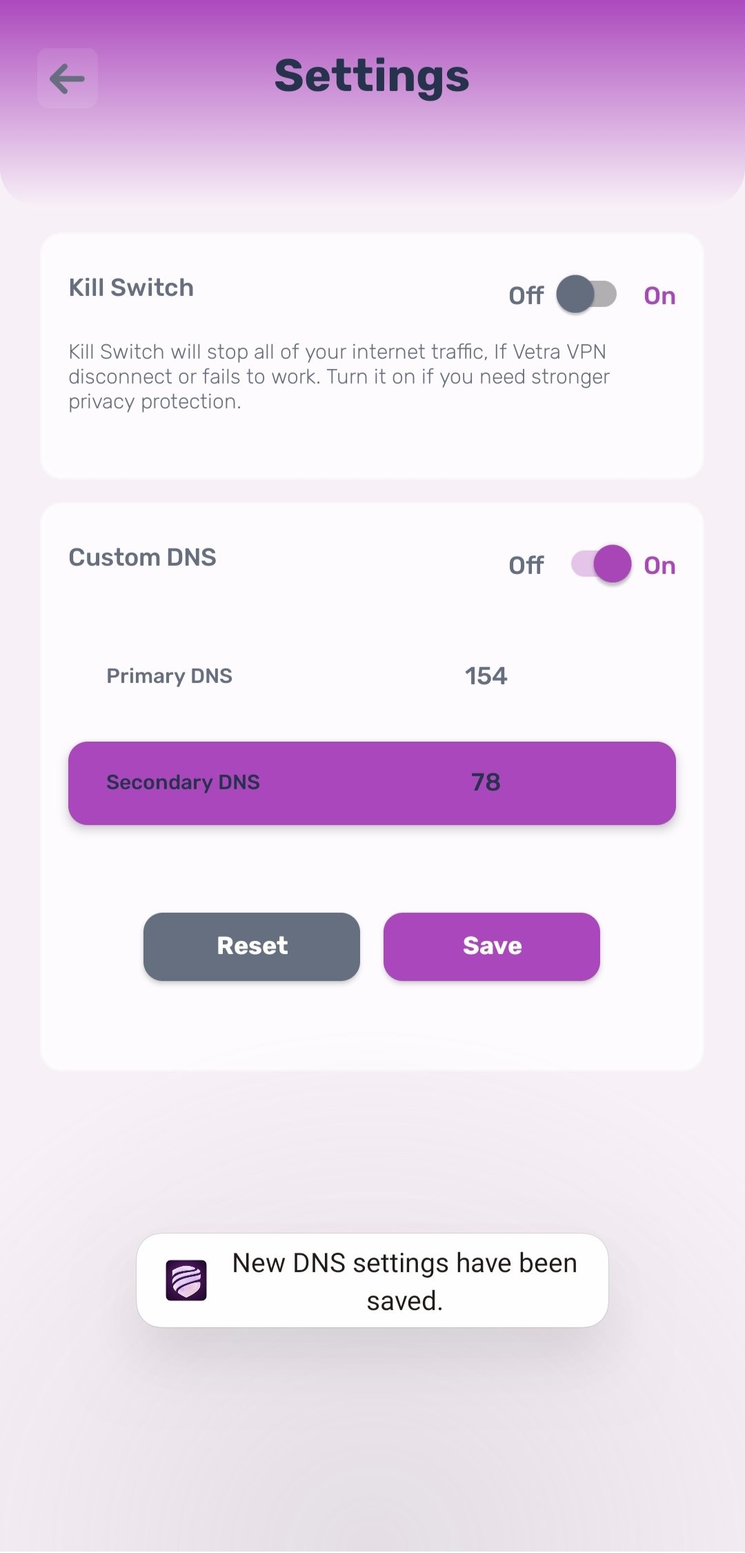 Designed with advanced security protocols and a high level of encryption, Vetra VPN APK allows us to have more control over this aspect. It enables us to configure a custom DNS by typing in the system numbers ourselves.
