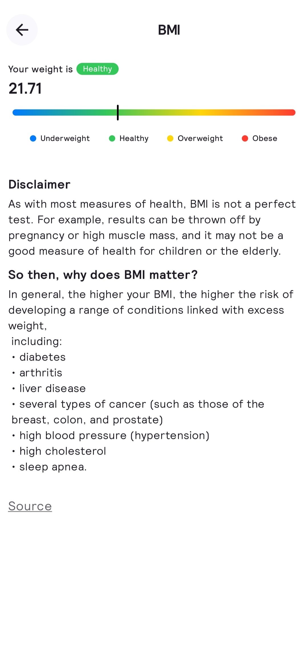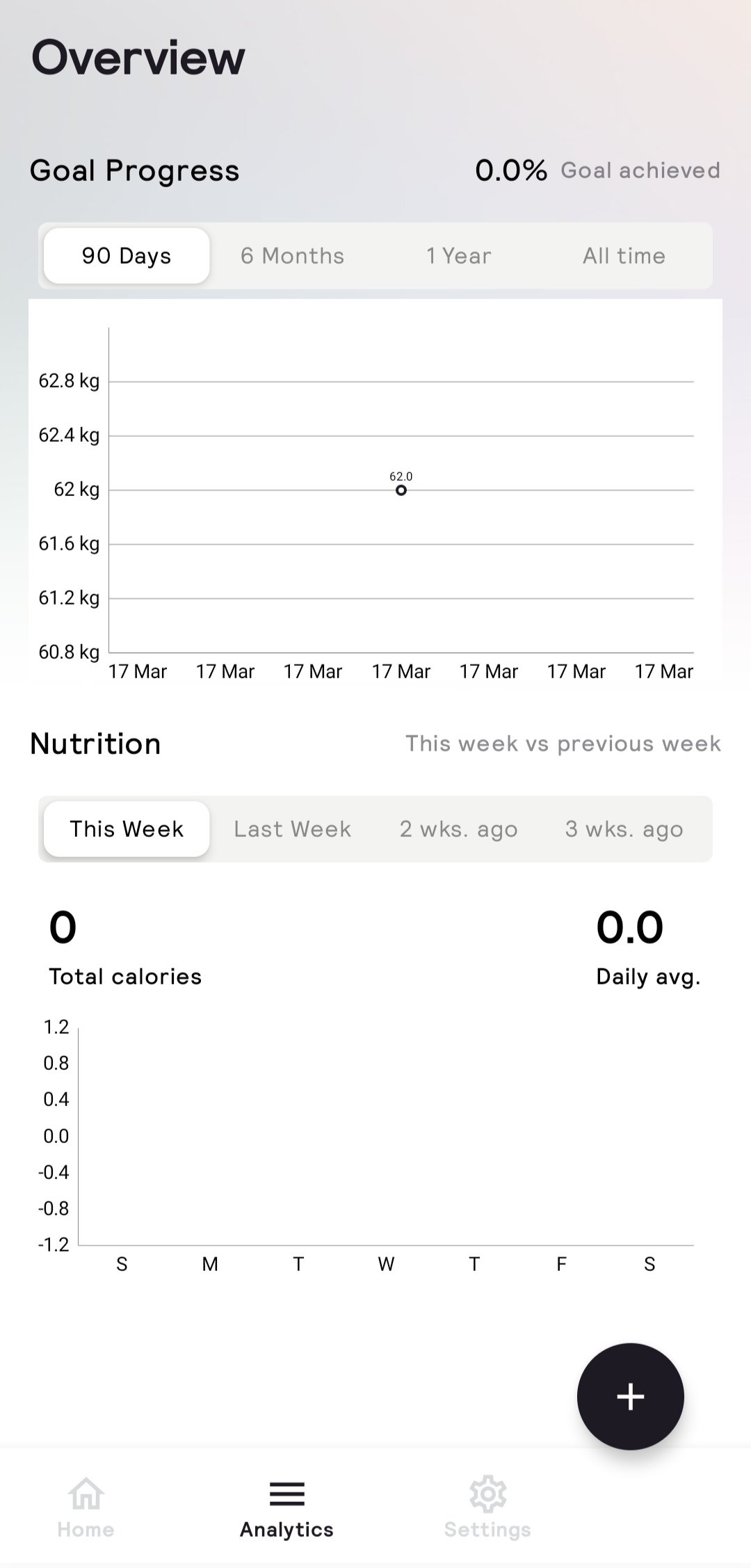 In the analytics section we can view the pre-set weight goal, our BMI, our progress towards that goal and weekly calorie data.