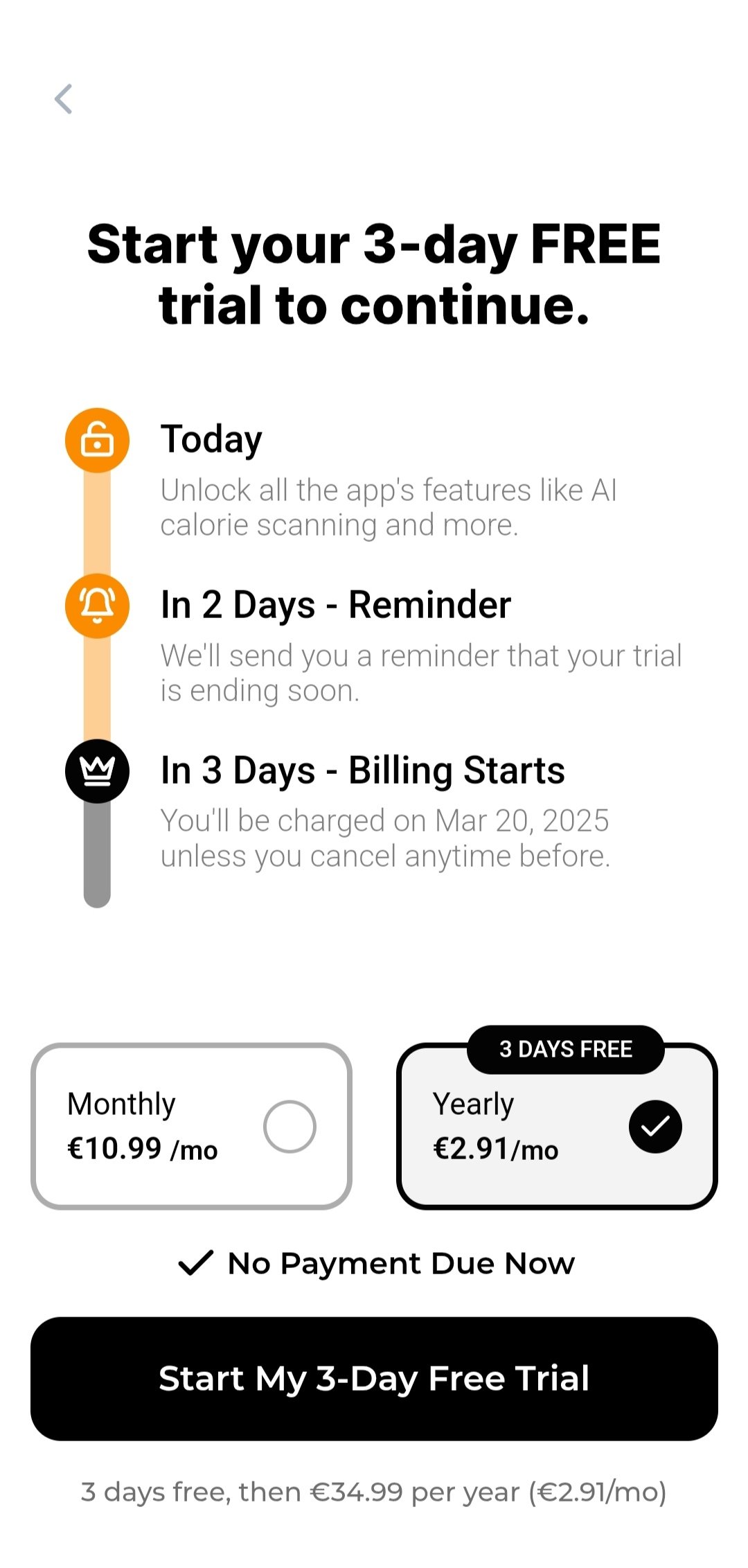 Although you can download Cal AI for free, you will need to subscribe as a prerequisite to use the camera with food and the rest of the app's functions. It offers a monthly or annual payment plan, the latter with a three-day trial at zero cost.