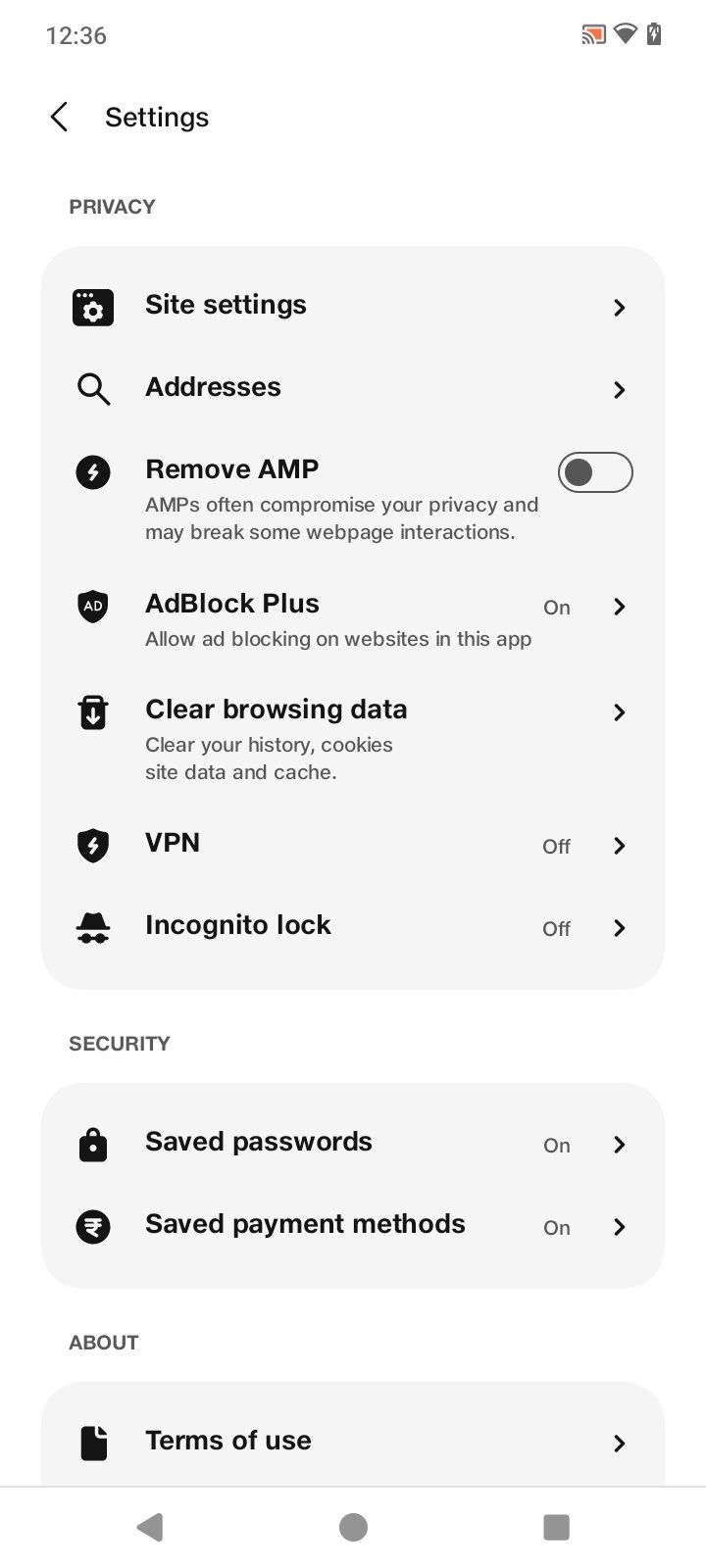 Security and privacy features like VPN, anti-tracking, ad blocker, and code-protected incognito mode.