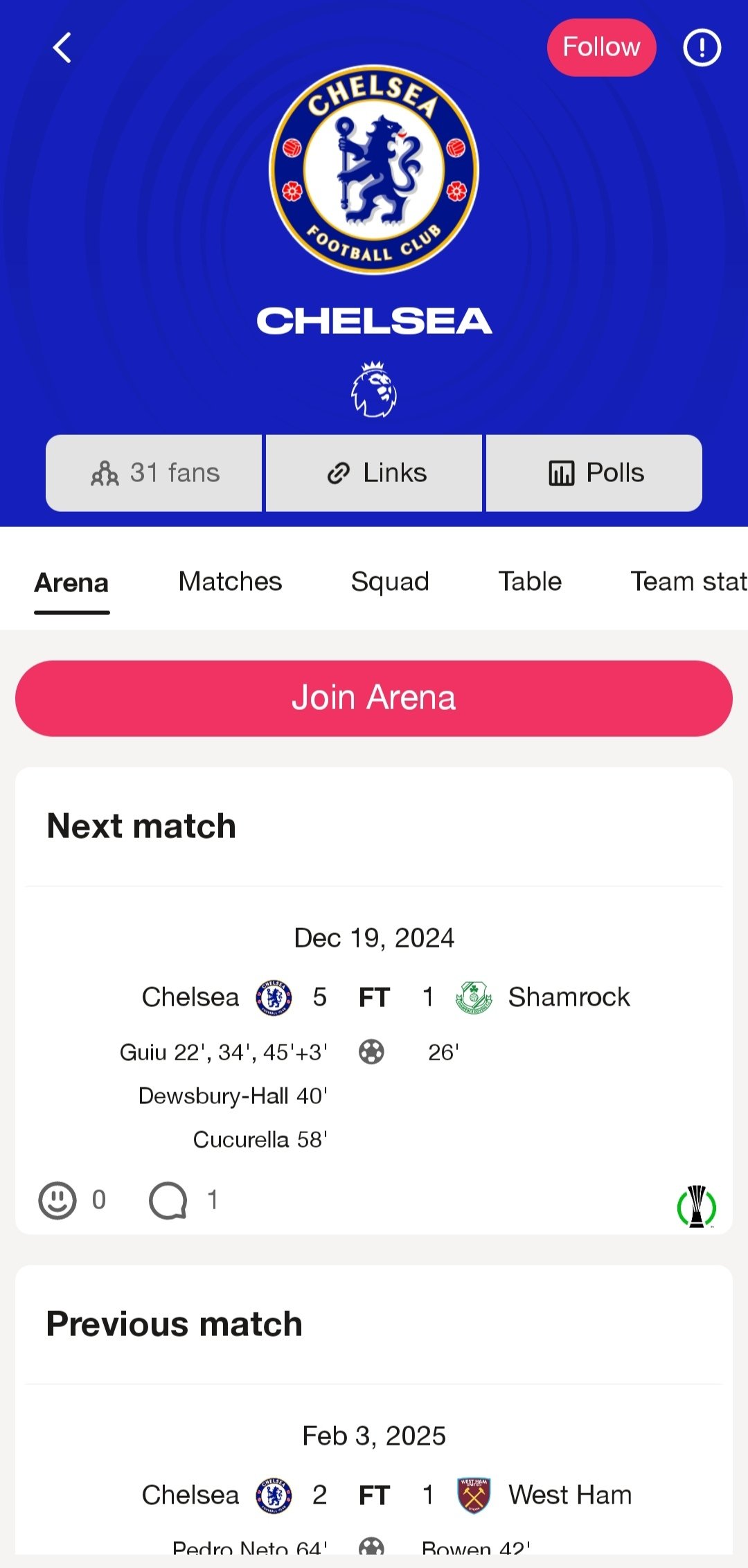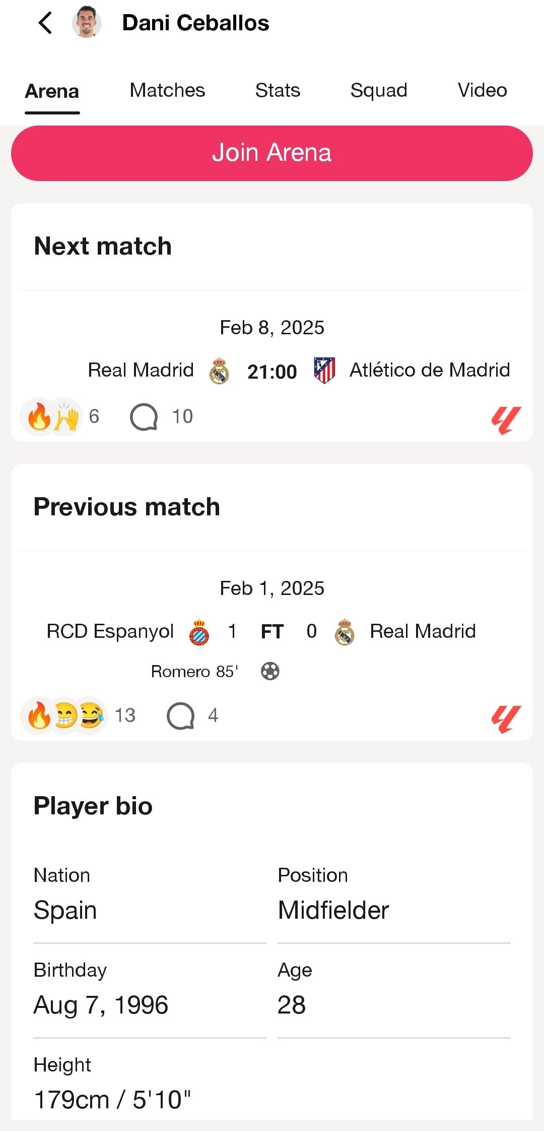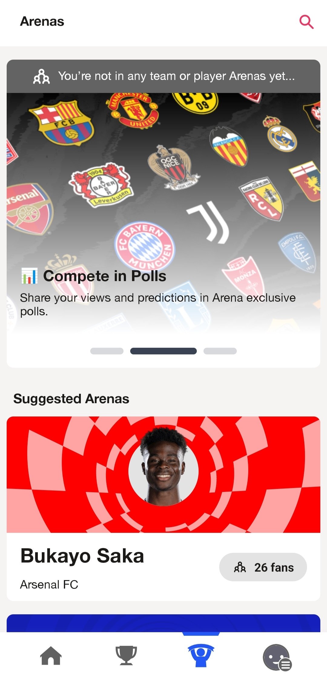 The third section of the menu in the EA Sports App is called arenas. They are spaces designed for us to participate in surveys and result prediction. At least, regarding the teams and players you follow or who are your favourites.