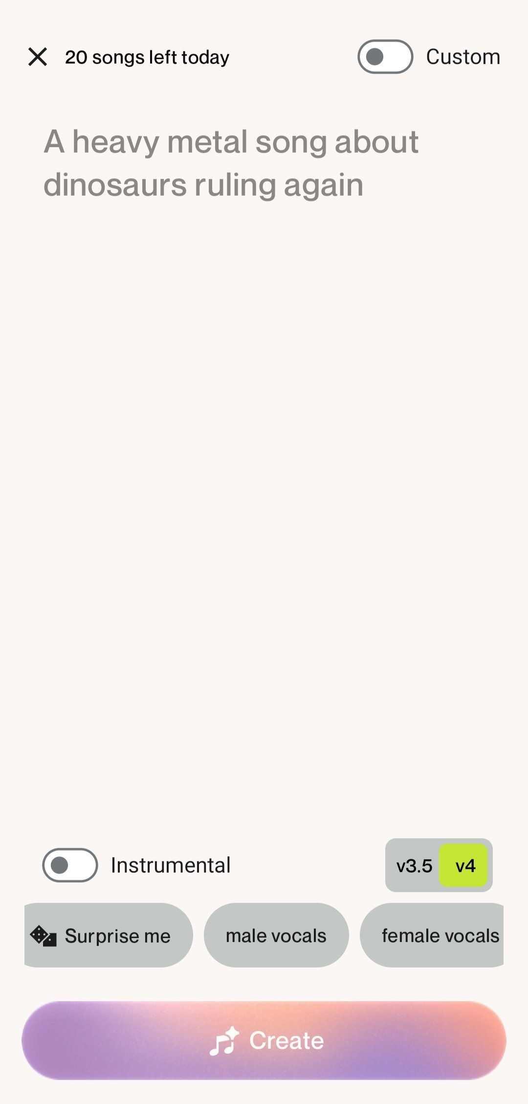 Type a brief description of what you want or the details that should characterize the song. You are free to type anything, although there are suggestions, and you can even let the application surprise you.