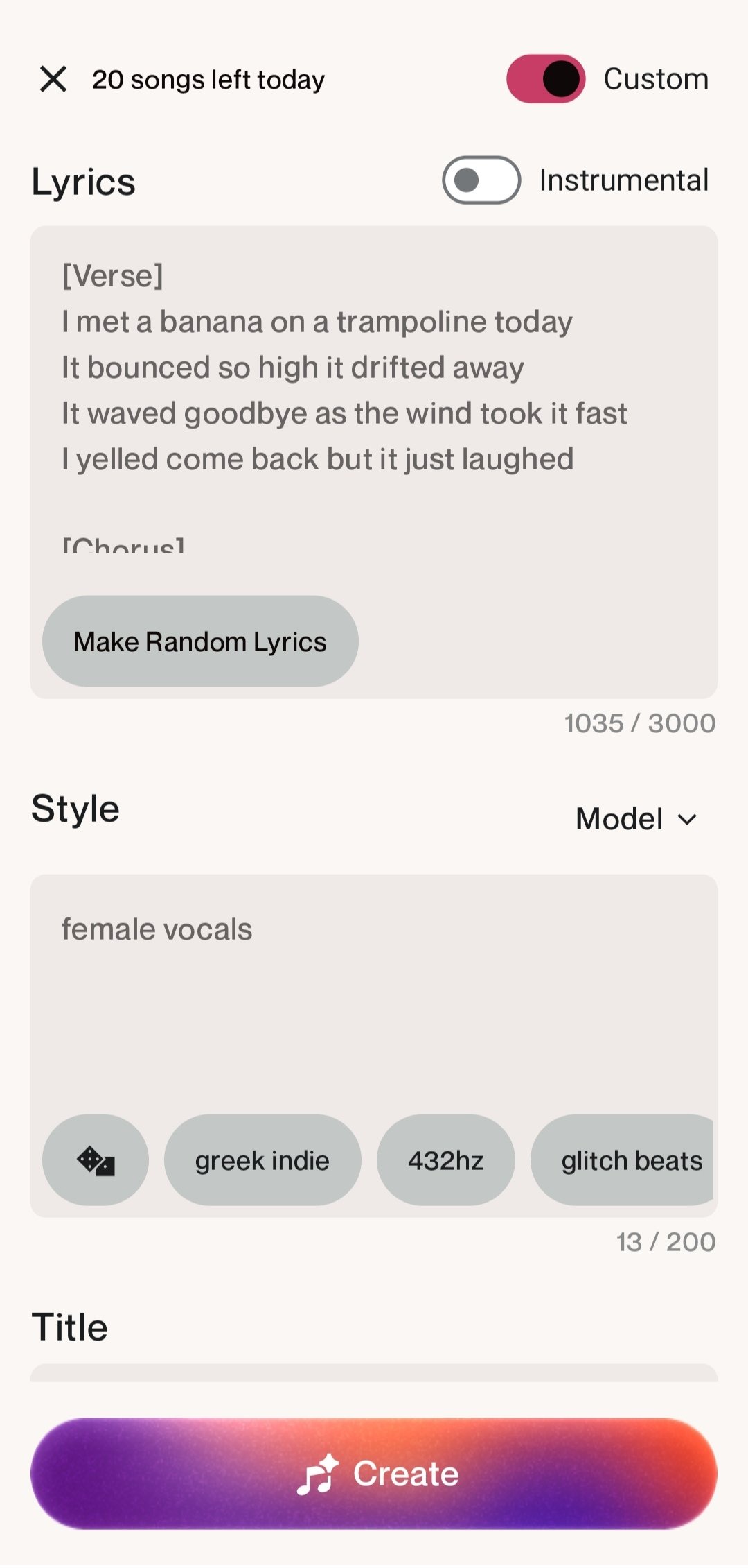 Customize the lyrics, style, and title from the beginning, writing all this in their corresponding boxes.