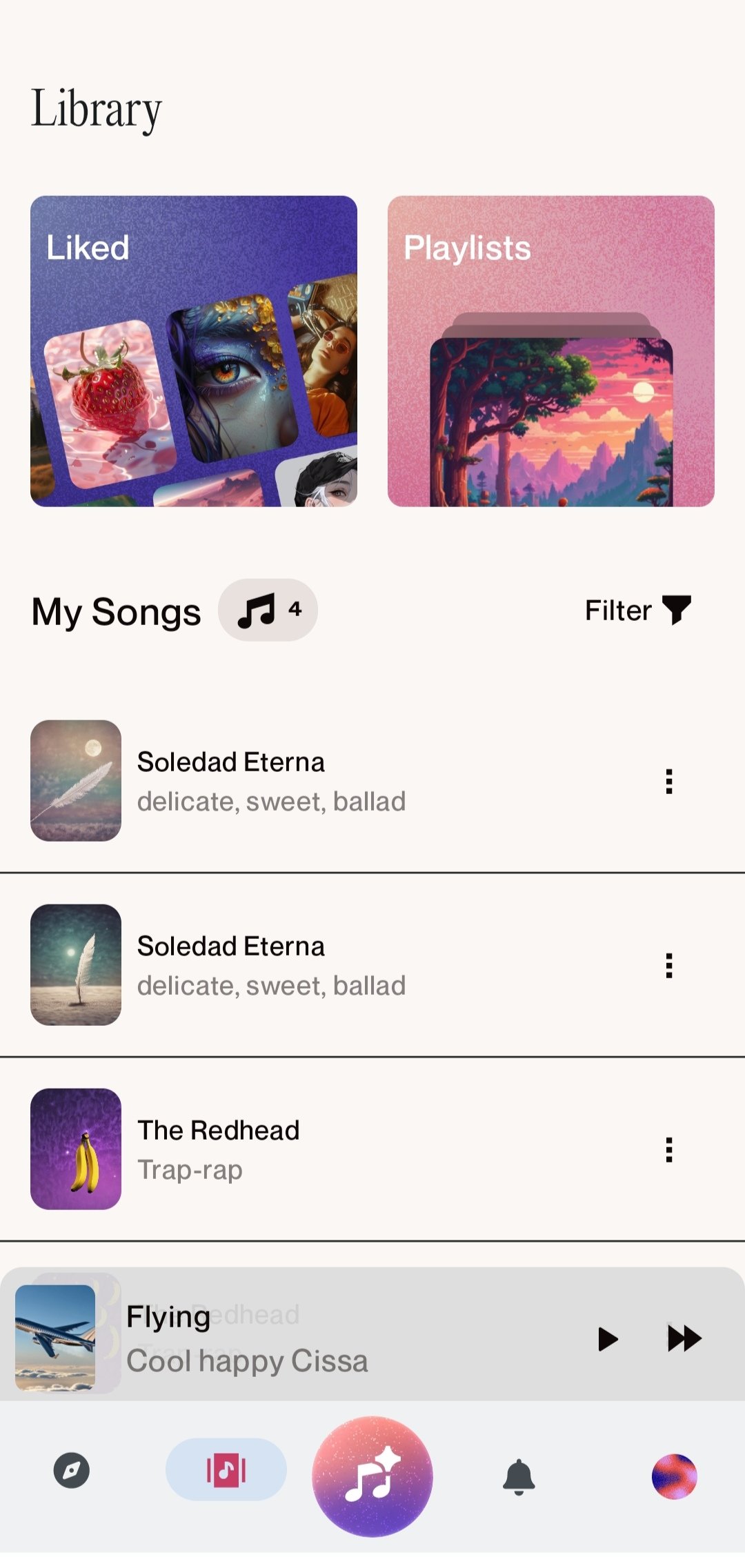 You can quickly find your generated compositions within the virtual library that Suno AI Android offers. Also, at the top left, you can access a playlist with the songs you like from other users.