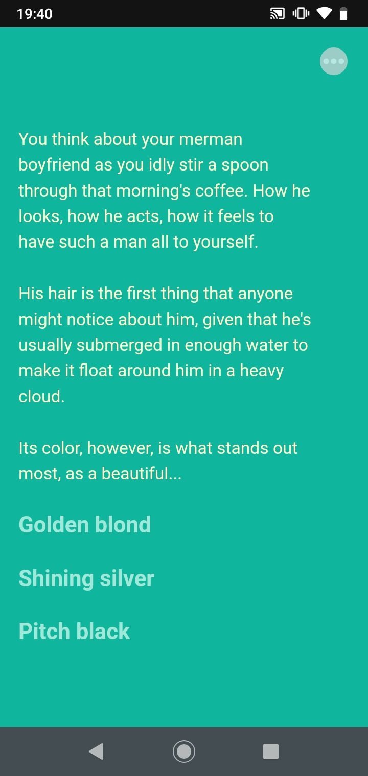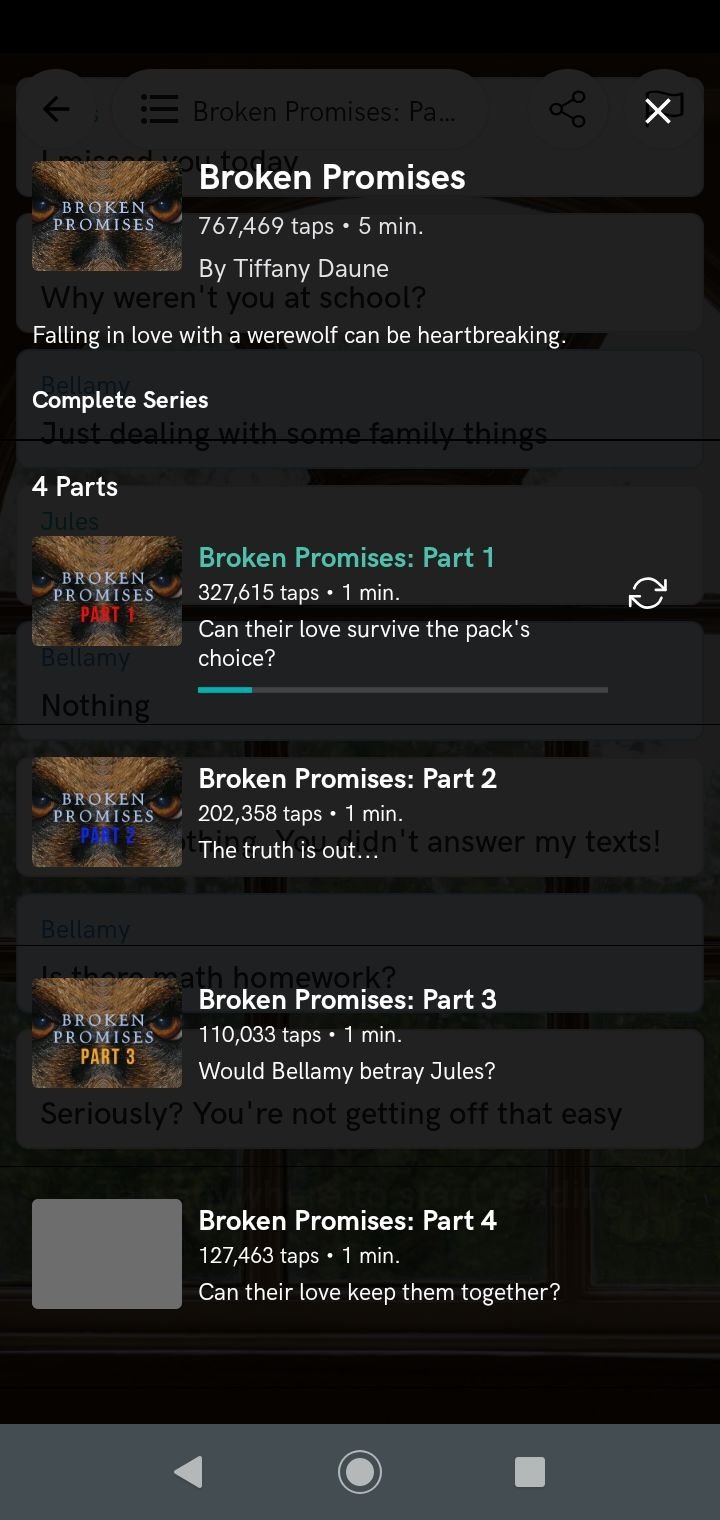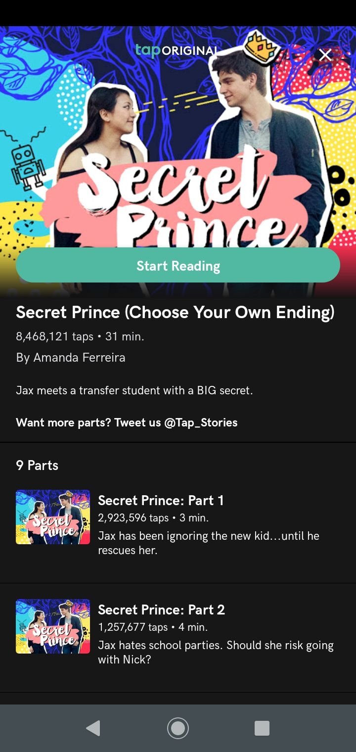 Before choosing a story, you will be able to see all the details about it, such as its title and author, as well as a small summary, the parts of which it is composed and the approximate reading time. To read, tap the green button and unlock the dialogues by gently pressing the screen.