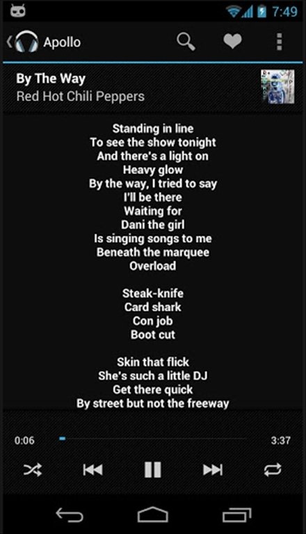 Apollo was developed based on the original Android player and is the default application included in the CyanogenMod 9 and 10 ROMs.