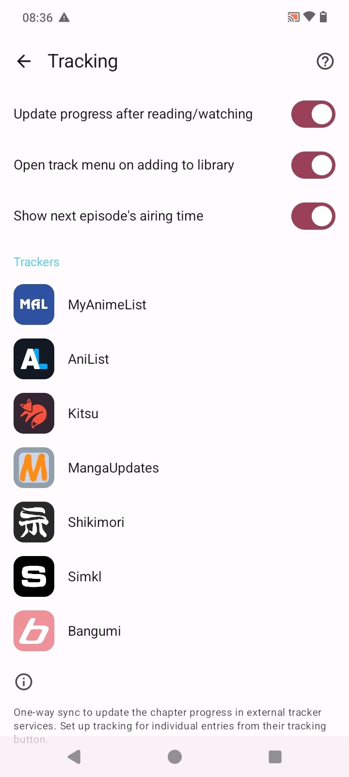 Integration with tracking services: MyAnimeList, AniList, and Kitsu.