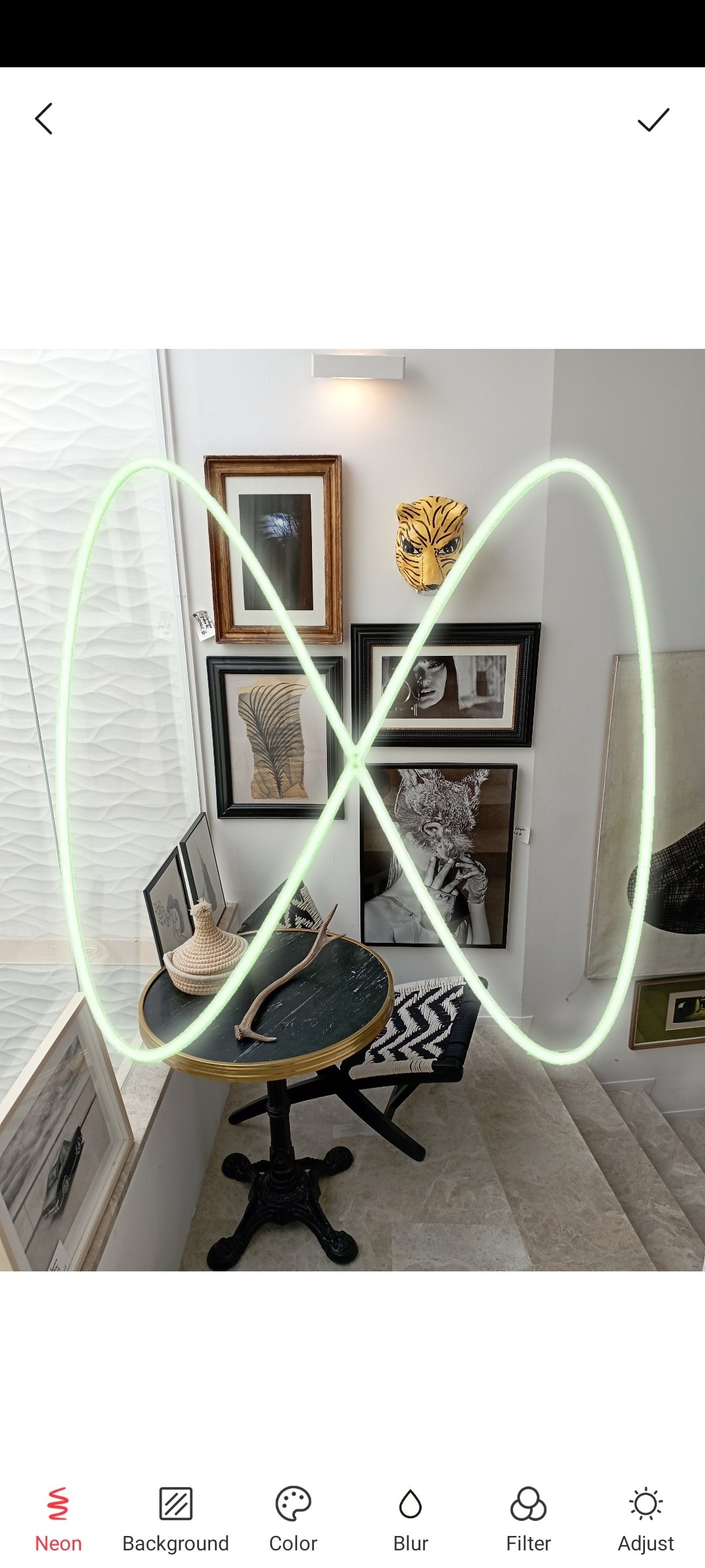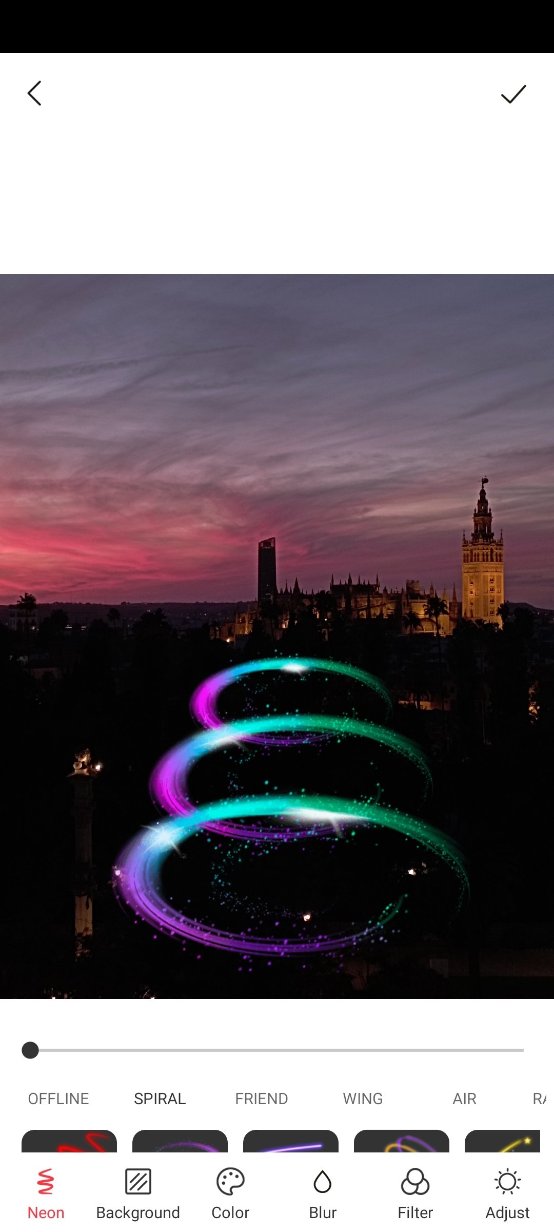 You can also modify them with neon effects of up to 15 different categories and the beaches, cities, gates, natural landscapes or roads backgrounds. There are other tools to blur, change color and adjust contrast, saturation, temperature, brightness, etc.