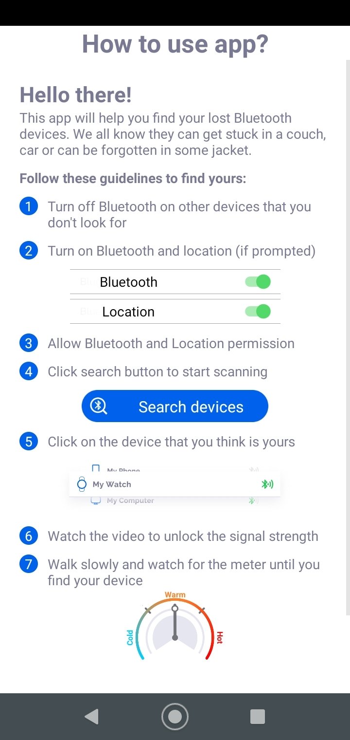 Nowadays, more and more devices are equipped with Bluetooth technology. And many of them are portable... which means that we often lose them or don't know where we left them. This practical app will help us find them with the classic hot-cold system.