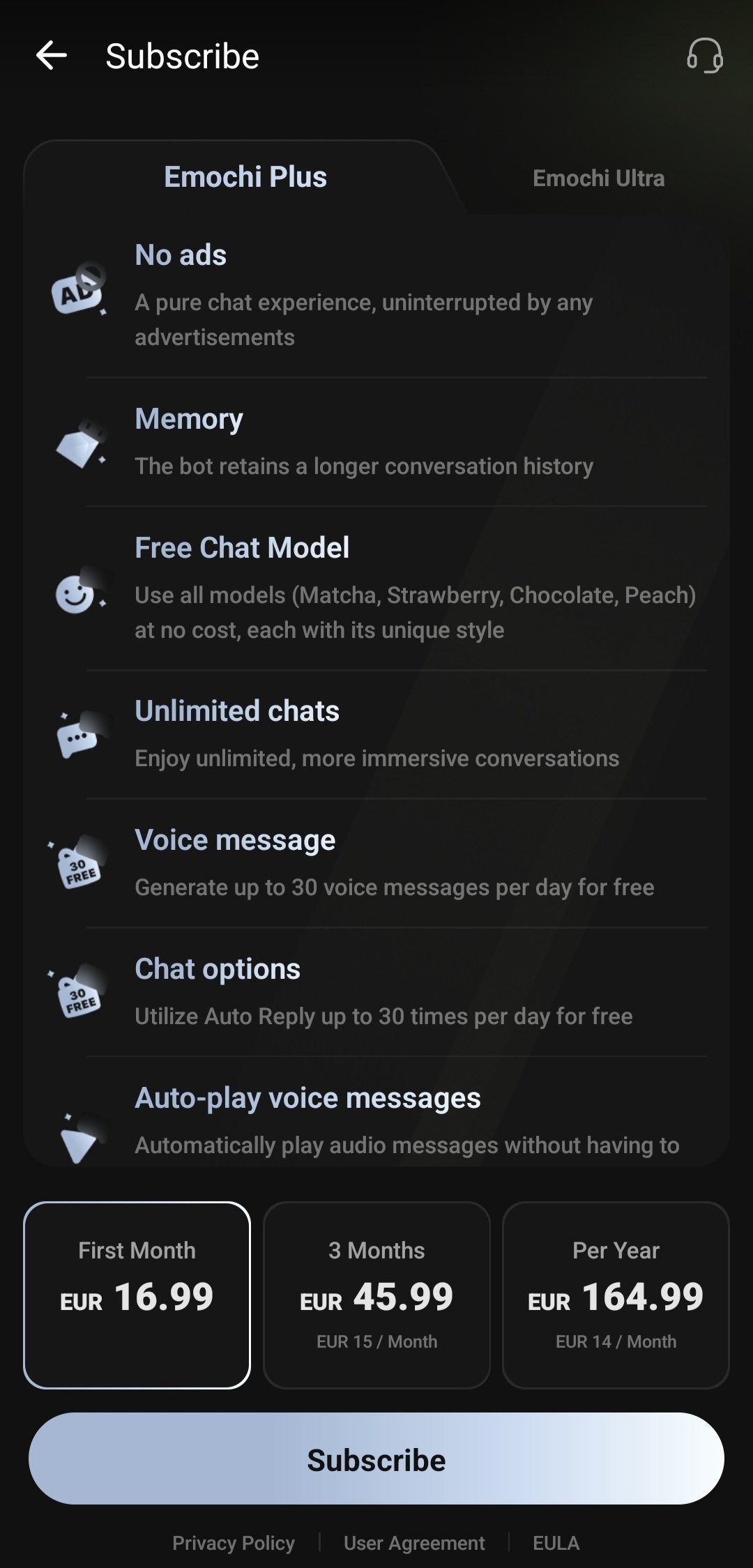 Download Emochi Android for free and use at no cost. There are two subscription models (plus and ultra) that bring more benefits. Such as unlimited chats, avatar memory on old conversations or receiving voice messages.