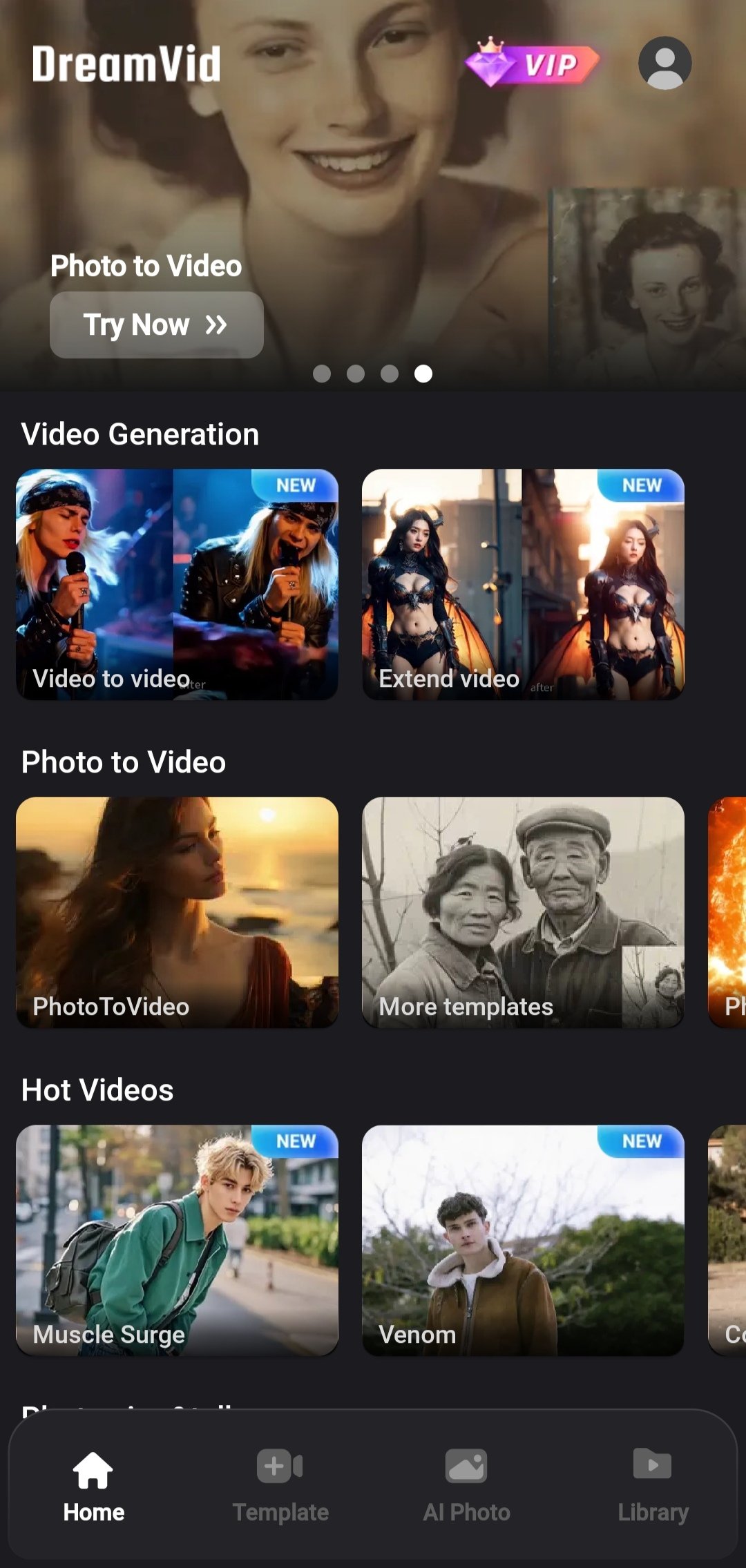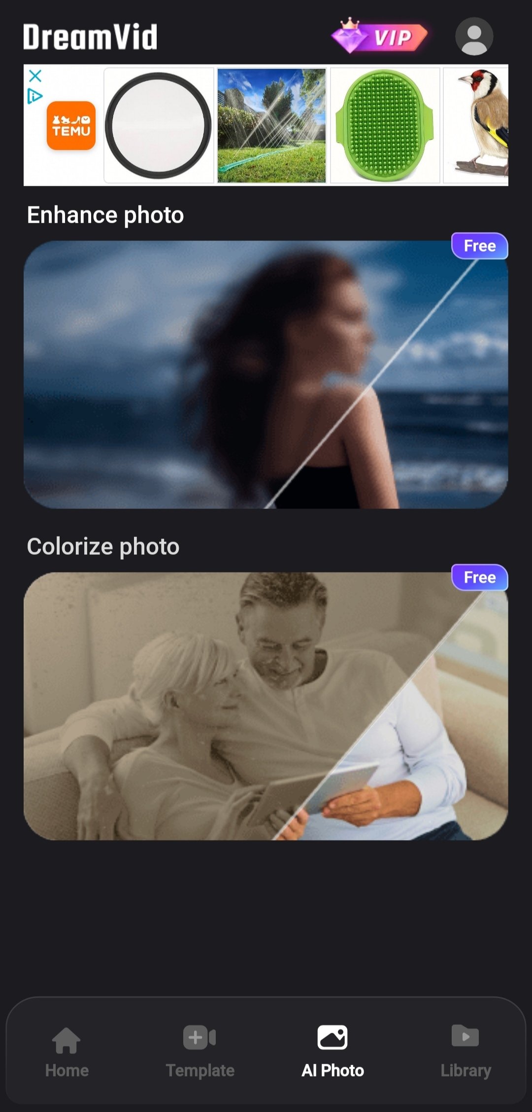 DreamVid contains more than 14 features that use AI to turn photos into short videos through the use of specific templates. It also enhances images