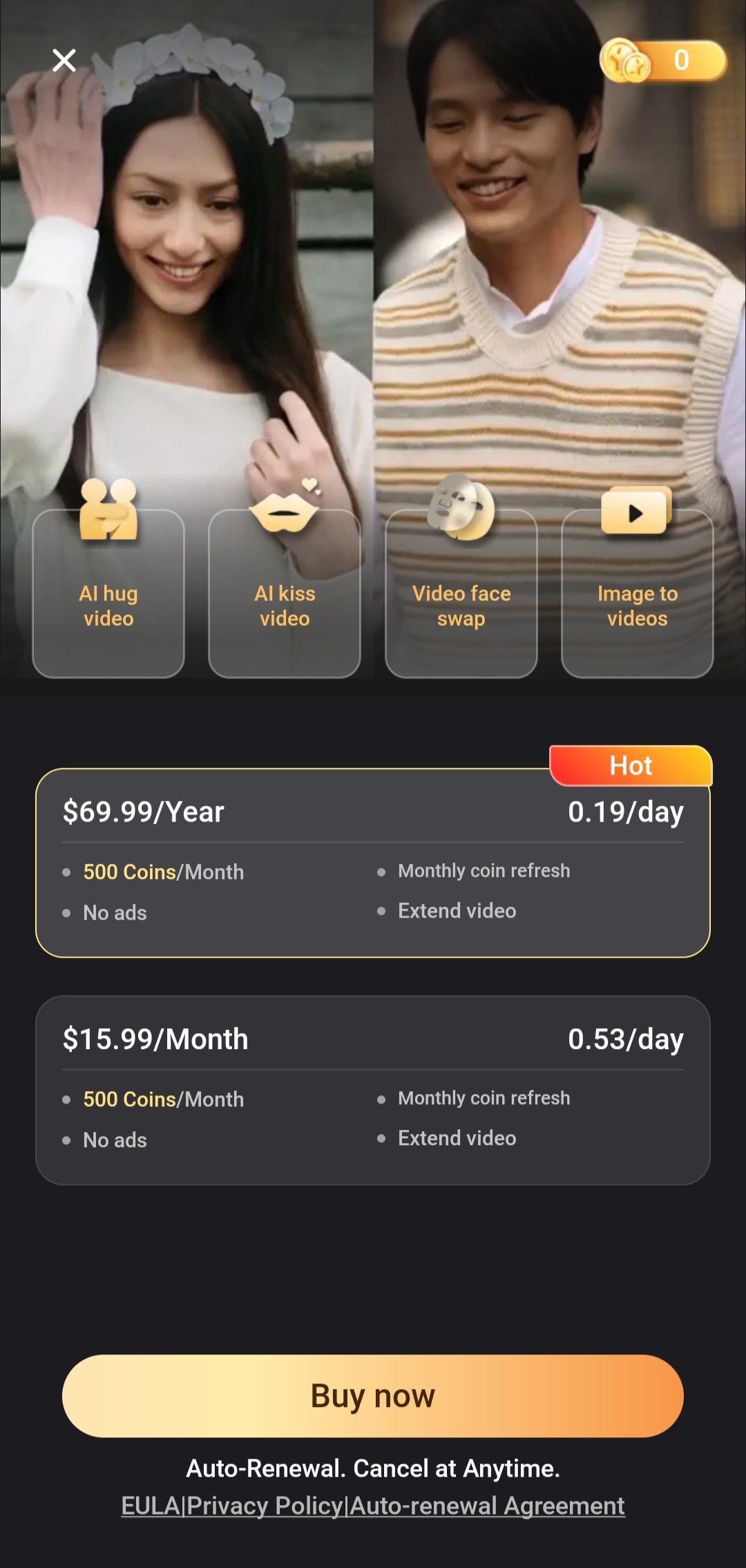 The bad news you need to know before you download DreamVid for free is that a subscription is required in order to be able to generate content. It doesn't give you any initial free credits or any other options. You can choose from either a monthly or annual plan.