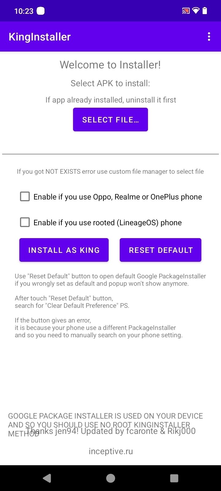 Installing packages as Google Play avoids compatibility issues caused by certain apps that apply restrictions based on the source of the installation. In addition, it also contains specific options for Oppo, Realme, and OnePlus devices, as well as rooted phones.