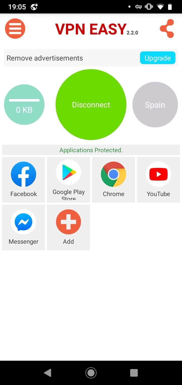 In the list below, we can see the apps protected by the system, but we can add more by tapping the add icon and choosing the applications we want on the list. When we are done using the VPN, just touch the green button again.
